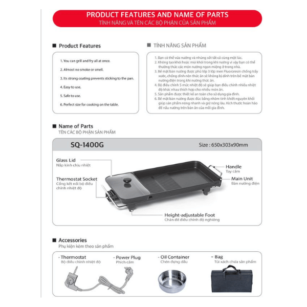 Nhằm đáp ứng sở thích ăn các món nướng mà không chứa nhiều dầu mỡ và an toàn cho người sử dụng thì Thương Hiệu Tiger Queen đến từ Hàn Quốc chuyên sản xuất các sản phẩm nhà bếp, gia dụng nói chung đã cho ra đời những mẫu bàn nướng điện hiệu Tiger Queen cao cấp tại thị trường Việt Nam. Bàn nướng điện Tiger Queen SQ-1400G được sản xuất từ linh kiện cao cấp có độ bền cao và không chứa chất độc hại, thiết kế nhỏ gọn, sang trọng, hiện đại và an toàn luôn luôn có mặt trong mọi không gian nhà bếp. Hơn thế nữa, với công nghê phủ 3 lớp tráng men Fluororesin dầy 4mm chỉ có ở Hàn Quốc cho bề mặt bàn nướng khả năng chịu nhiệt cao, chống trầy xước, chống dính và thức ăn chín đều nhanh mà không bị khét, không tạo khói và không cần sử dụng nhiều dầu mỡ trong quá trình nướng là một sự lựa chọn lí tưởng giúp bạn chế biến và thưởng thức những món nướng yêu thích cho gia đình ngay tại bàn ăn mà vẫn giữ nguyên hương vị.