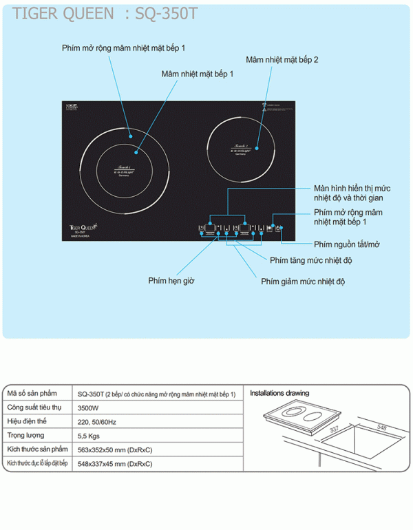 - Loại : Bếp đôi âm (Có mở rộng đường kính nấu ở mâm nhiệt 1)