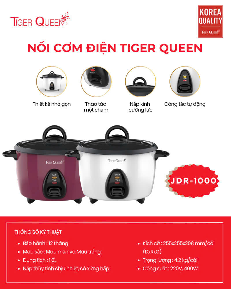 Nhằm đáp ứng nhu cầu nấu cơm thơm ngon, nhanh chóng, dễ dàng, an toàn và tiện lợi để phục vụ những bữa cơm đa dạng cho người nội trợ cũng như giữ được hương vị và độ ngọt của hạt cơm thì Thương hiệu Tiger Queen đến từ Hàn Quốc chuyên sản xuất các sản phẩm nhà bếp, gia dụng nói chung đã cho ra đời những mẫu nồi cơm điện hiệu Tiger Queen cao cấp cho thị trường Việt Nam dựa trên nguyên tắc cân bằng nhiệt, hơi nước và thời gian nấu. Nồi cơm điện nắp rời Tiger Queen 2 trong 1 JDR-1000 được sản xuất từ linh kiện cao cấp có độ bền cao và nhựa không chứa chất độc hại, thiết kế nhỏ gọn, sang trọng, hiện đại và an toàn luôn luôn có mặt trong mọi không gian nhà bếp.